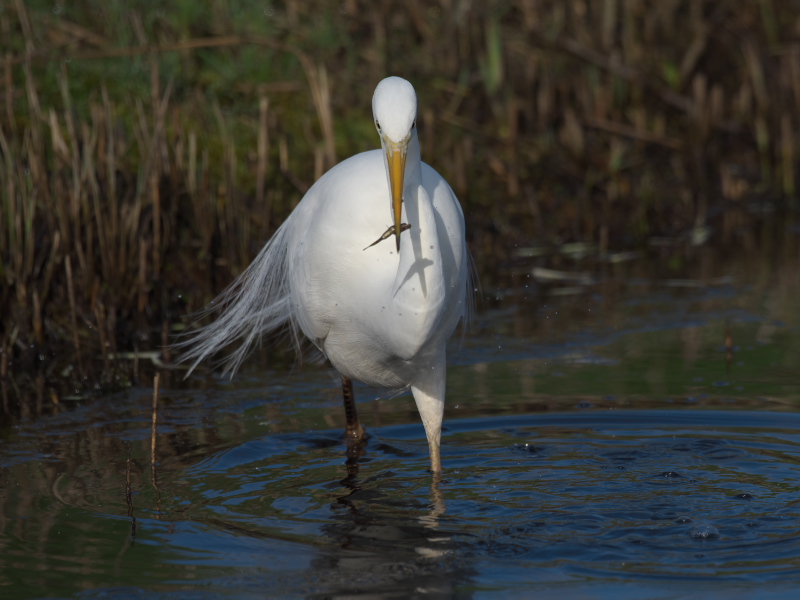 Diesen Silberreiher konnte ich am letzten Samstag in Hüde fotografieren. Er stand im Dorfgraben bei den Ferienhäusern an der Zufahrt zum Hafen. Er ließ sich überhaupt nicht von Autos, Fahrrädern und Fußgängern auf der Straße direkt neben dem Graben stören, ich hielt vielleicht sechs Meter entfernt im Auto. An der Stelle ist schon seit Jahren ein Silberreiher unterwegs, so zutraulich habe ich ihn allerdings bisher auch noch nicht erlebt.